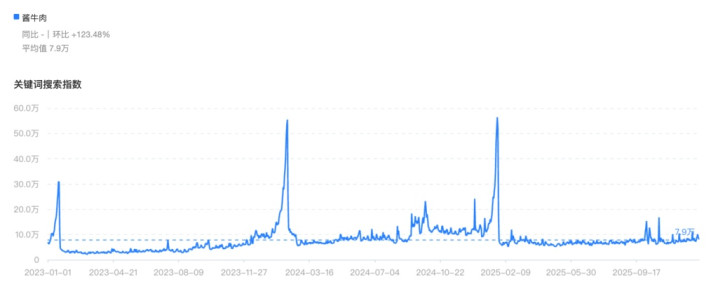 比如在应酬平台上就不错看到,往日3年里,左近除夜夜的前几日,酱牛肉这说念菜的搜索指数就极速高涨,是宽泛里搜索量的7.6倍。