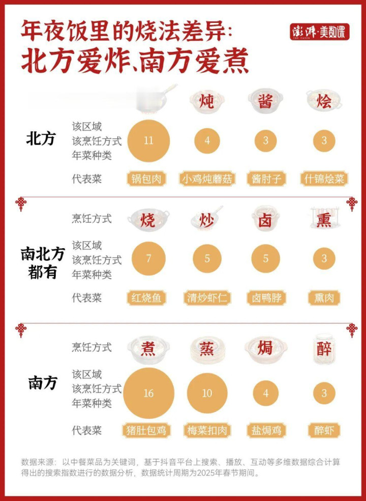 在那些被高频搜索的年菜中,咱们发现南边菜的烹调状貌以蒸为主,而朔方则有更多的菜是用了炸、炖的状貌。举例在东北,性情菜即是各式炖菜。小鸡炖蘑菇、猪肉炖粉条、酸菜炖白肉血肠……而南边用蒸来科罚各式食材,肉不错蒸、鱼不错蒸、蛋不错蒸。