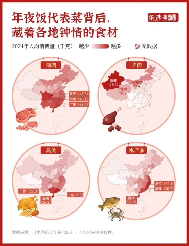比如海南的文昌鸡、两广的白切鸡,这些所在的除夜餐桌上细则少不了禽类食材。2024年,海南、广东、广西的东说念主均禽肉消耗量诀别为26.3千克、25.0千克和22.3千克,包揽宇宙前三。