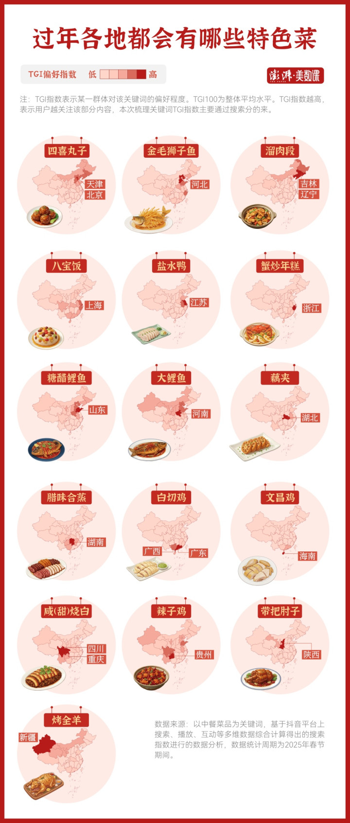 为了找到各省份的性情除夕饭,咱们引入TGI偏好指数(TargetGroupIndex),即用各地区用户在春节本领对各菜品的搜索偏好度联系于宇宙用户合座搜索偏好度的统计,来分析各地齐有哪些性情除夕饭。
