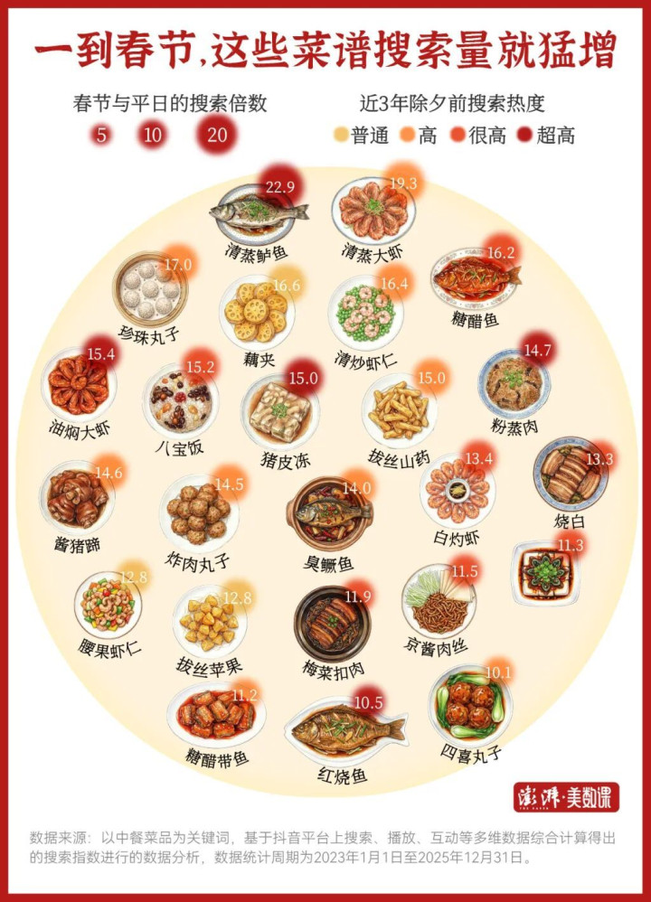 以春节和宽泛的搜索指数比例达10倍为界,咱们找到了那些在除夕饭中会被行家高频念念到的菜。