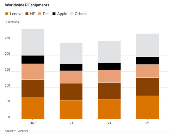 巨匠PC出货量(开端:Gartner)