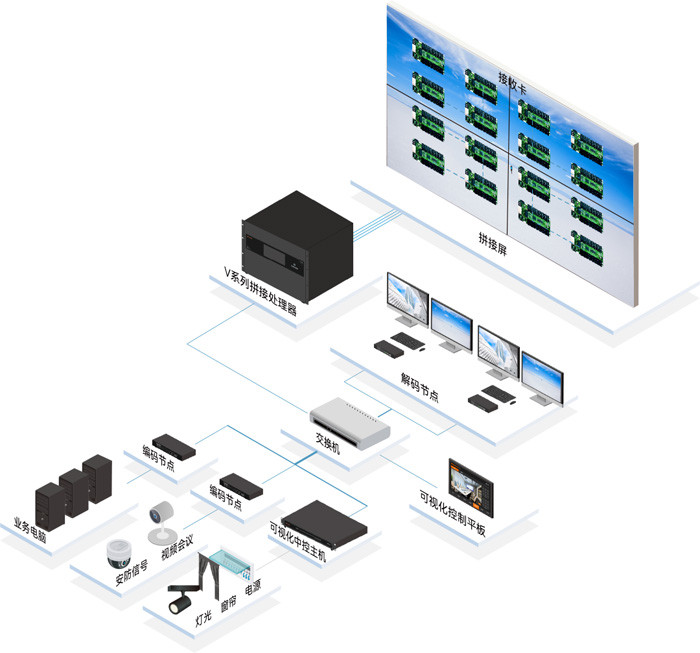 羽控指控中心全链路惩处决议,深度会通LED甩掉器、发送器、禁受卡、拼接处理器等高性能视频处理征战,将散布式、坐席、播控、中控、音频等多元子系统进行无缝集成,构建从信号积贮到超高辞别率上墙的好意思满显控链路,罢了全成分协同与无缝管控。依托散布式架构,罢了海量信号跨地域无损传输与互通;搭配KVM坐席融合系统,撑抓东谈主机分离、一键推送及权限治理,大幅擢起用导调治效用。