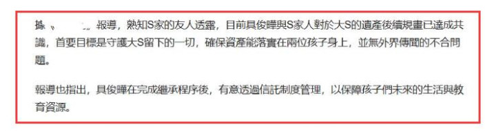据台媒报说念,具俊晔也曾和S家东说念主竣事了共鸣,把大S留住来的遗产,将以相信的神色最终落实到玥儿姐弟身上。也就是说,不管是具俊晔照旧S妈,齐决定烧毁领受这笔遗产。之是以用相信神色,大要率S家亦然为了老套孩子们的这笔钞票被汪小菲独占。