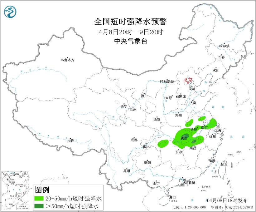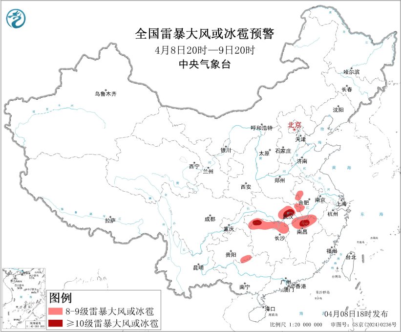 瞻望4月8日20时至9日20时,江汉、江淮西部、江南北部等地的部分地区将有8级以上雷暴大风或冰雹天气,其中,湖北东部和南部、湖南西北部、江西北部等地的部分地区将有10级以上雷暴大风,最大风力可达11级以上,局地不摒除出现龙卷的可能性;江汉、江淮、江南北部等地的部分地区将有小时雨量大于20毫米的短时强降水天气,其中,湖北东部、江西北部等地的局地小时雨量大于50毫米。