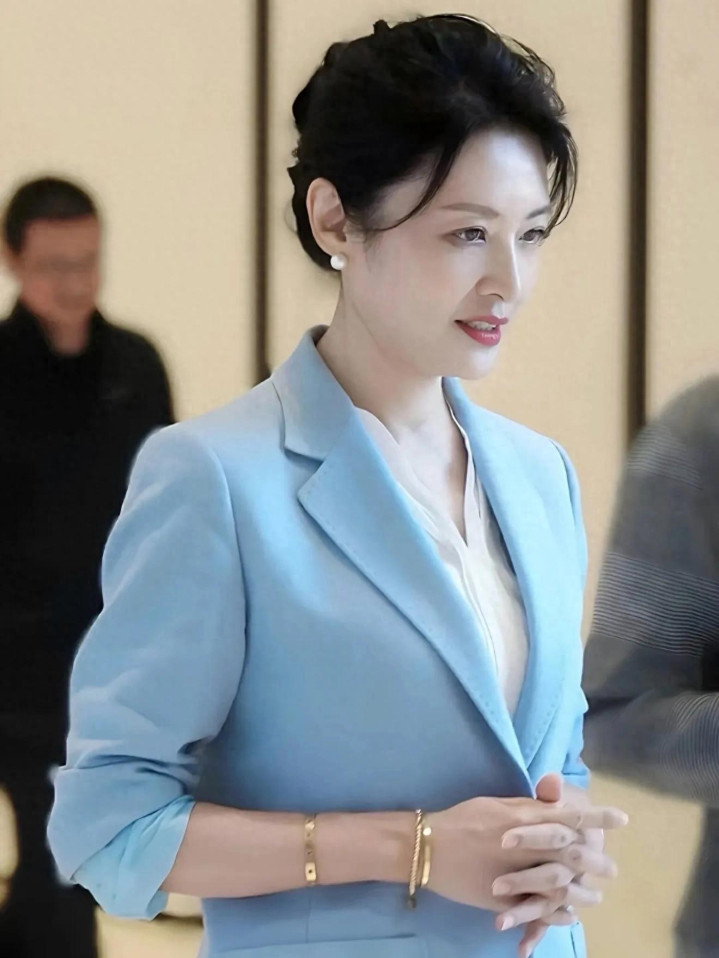 在配饰上,蓝色西装和珍珠耳饰适配度好高!更是和发型搭配的恰到自制!