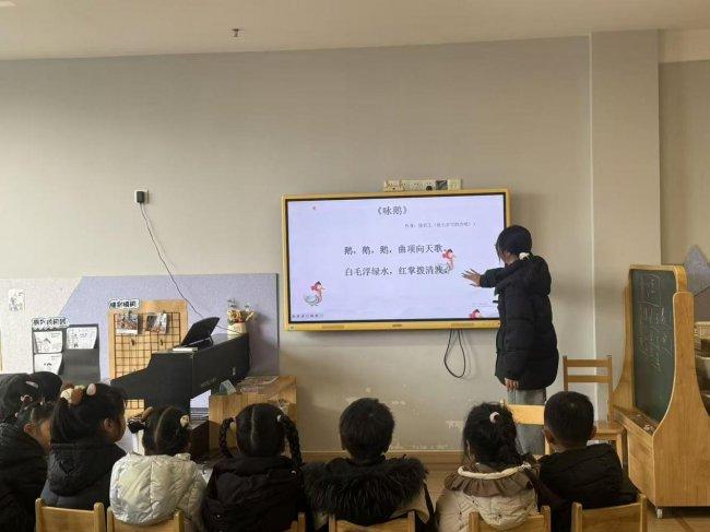 随后,杨奕瑶引出洋学小课堂《咏鹅》,通过动画演绎骆宾王七岁作诗的趣事,将“鹅鹅鹅,曲项向天歌”的韵律感娓娓说念来。孩子们随着憨厚鼓掌朗读,为匡助幼儿见地诗意,她盘算推算了千里浸式体验行动:当讲到“白毛浮绿水,红掌拨清波”时,杨奕瑶指令孩子们用手臂模拟湖面波澜,瞎想白鹅划水的姿态;纠合动态图领悟“白毛”“绿水”的色调对比,让抽象诗句化作可触可感的画面。孩子们时而效法鹅掌拨水的算作,时而用小手比划波纹,课堂歧视活跃。