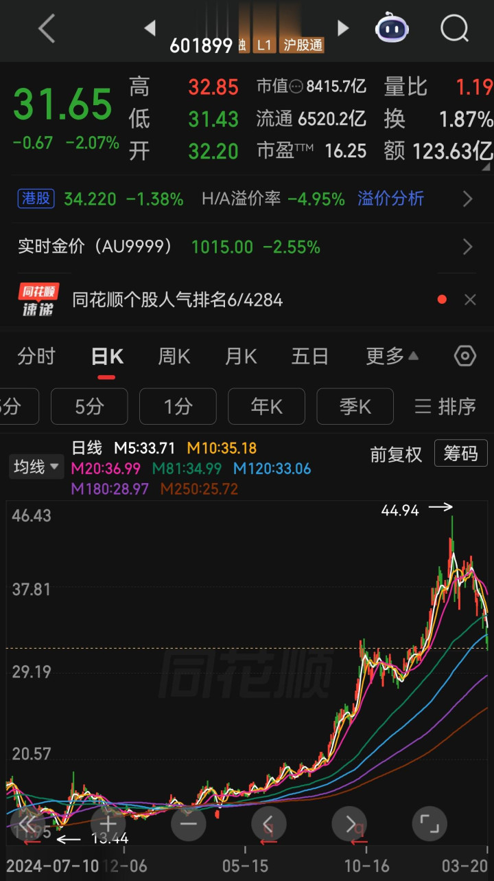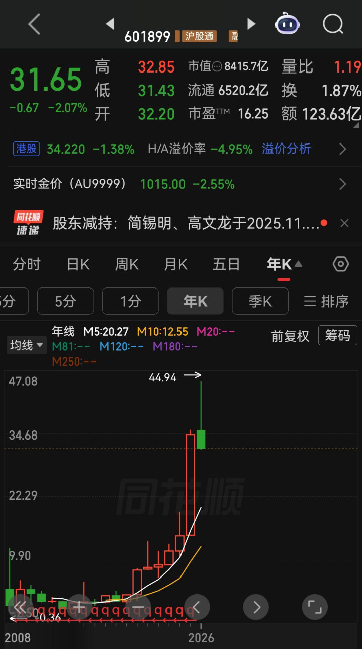 其实紫金矿业现阶段的股价回调,实质上是前期涨幅过大后的正常调度。从2024年底到2025年底,公司股价从15.12元涨到最高44.94元,一年时辰翻了三倍,这样的涨幅也曾把功绩增长、行业景气度进步等通盘利好皆透支了。市集里的资金皆是逐利的,涨多了当然会有赢利盘了结离场,股价出现回调也就成了例必,就算莫得年报落地这个节点,短期的调度压力也一直存在。