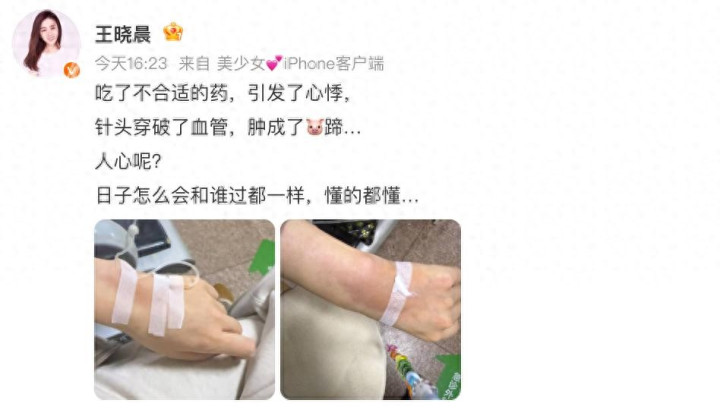 4月13日,王晓晨亚博体彩下载发文:吃了辩别适的药,激励了心悸,针头穿破了血管,肿成了猪蹄…东说念主心呢?日子奈何会和谁过齐雷同,懂的齐懂…