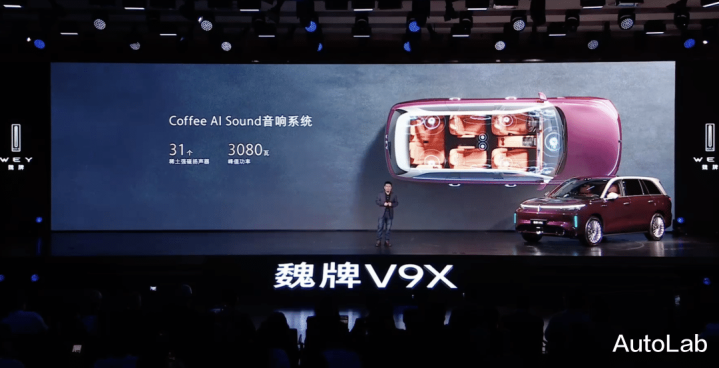 音响方面,魏牌V9X配备了一套领有31个扬声器Coffee AI Sound音响系统,峰值功率达到了3080W,参数在同级中特地顶。