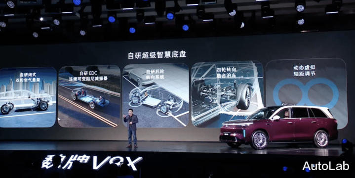 底盘部分,新车搭载了闭式双腔空气悬架和CDC减震器的同期,还全系标配的正负10度的后轮转向系统,转弯半径不错作念到小于5米,能够在双向单车说念里完成一把掉头。