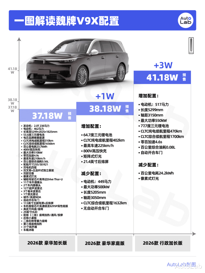 V9X共有3款SKU,预售价37.18-41.18万元,其中长轴的“豪华加长版”和“行政加长版”上市即托付,标轴的“豪华家庭版”7月开启托付。