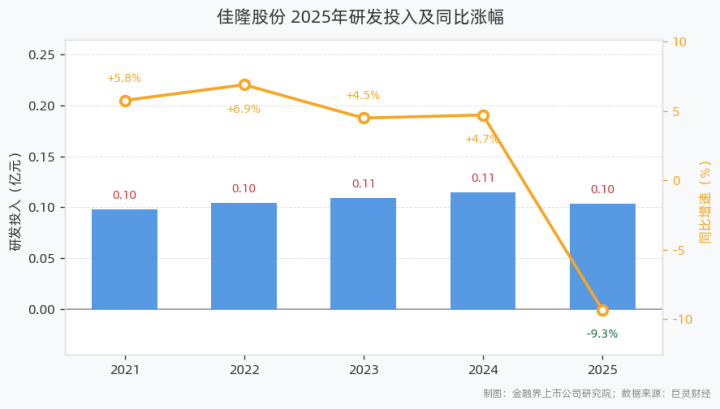 4月23日,佳隆股份(002495)表露2025年年度申报。申报期内,公司全年研发插足达0.10亿元,同比下滑9.34%,占贸易收入比例4.18%。往日五年,公司研发插足复合增长率为1.17%。