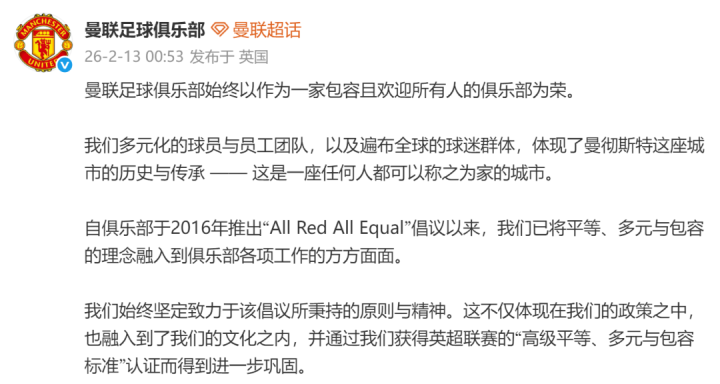 当地时代2月12日,曼联足球俱乐部官方发布声明,将本人定位为一家包容且热心的俱乐部,以此回复拉特克利夫的关系言论。