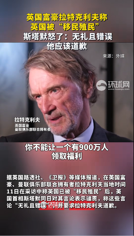 在拉特克利夫发表英国已被“侨民殖民”的关系言论后,英国首相斯塔默11日晚在外交媒体上发帖对其言论示意胁制,“(这种说法)是失礼的,何况乖张。英国事一个骄傲、宽厚和多元化的国度。吉姆·拉特克利夫应该谈歉。”